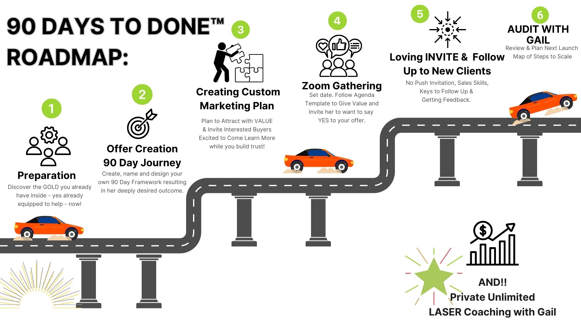 Client Favorite! Private, Unlimited 1:1 Laser Coaching sessions with Gail. Book a call, identify most important next steps, take action and then book your next call! (VALUE = $3K)